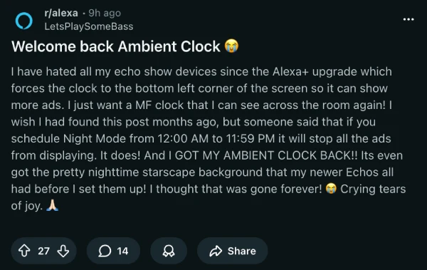 One neat trick right now is almost comically simple: schedule Night Mode for basically the entire day. In a fresh Reddit thread titled “Welcome back Ambient Clock 😭,” the OP claims setting Night Mode from 12:00 AM to 11:59 PM brought back the larger Ambient Clock and stopped ads from displaying. Not everyone gets the same result, though, with some commenters reporting that it briefly works and then snaps back to the tiny corner clock.