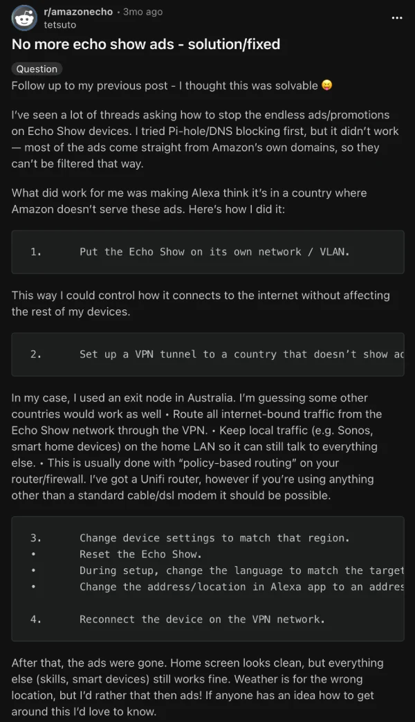 One r/amazonecho user says ads disappeared after routing only the Echo Show through a VPN to a region that seemingly gets fewer home screen ads, then matching device language and address to that country during setup. It’s clever, but it can also mean that you’ll see incorrect local weather details, a different content catalog, and the risk that Amazon changes the rules tomorrow.