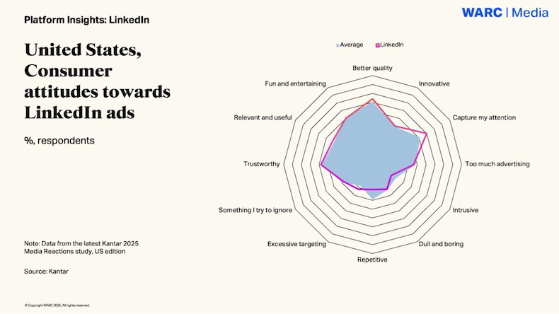 People in the United States tend to view ads on LinkedIn as being of better quality and more trustworthy compared with the average, according to Kantar data, as cited by WARC.