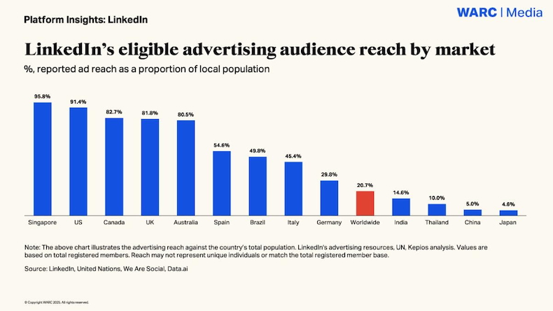 LinkedIn now reaches 20.7% of the eligible global advertising audience, according to third-party data cited by WARC. However, the platform’s reach varies widely among different countries. For example, LinkedIn reaches 91.4% of the eligible advertising audience in the United States but only 5% of the eligible advertising audience in China.