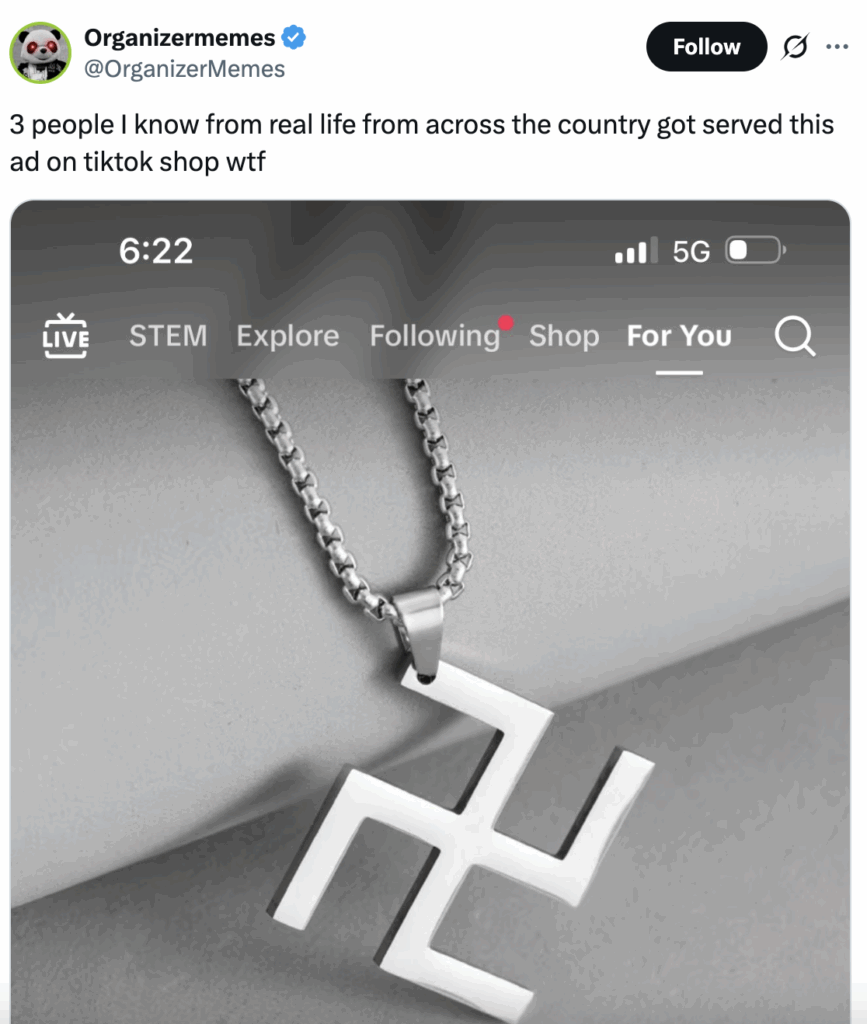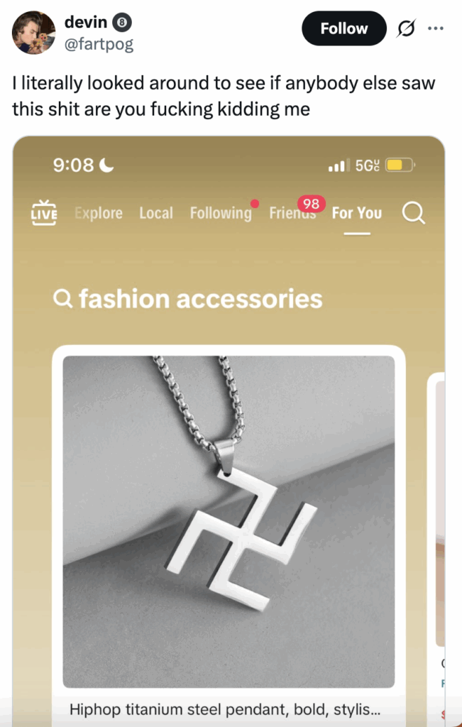News of the “Hiphop” swastika necklace also proliferated on X and TikTok itself, with users questioning why the item was for sale. Some also noted the hypocrisy of TikTok shop selling a swastika necklace, when users who try to make videos about it are blocked from doing so for breaking community guidelines.